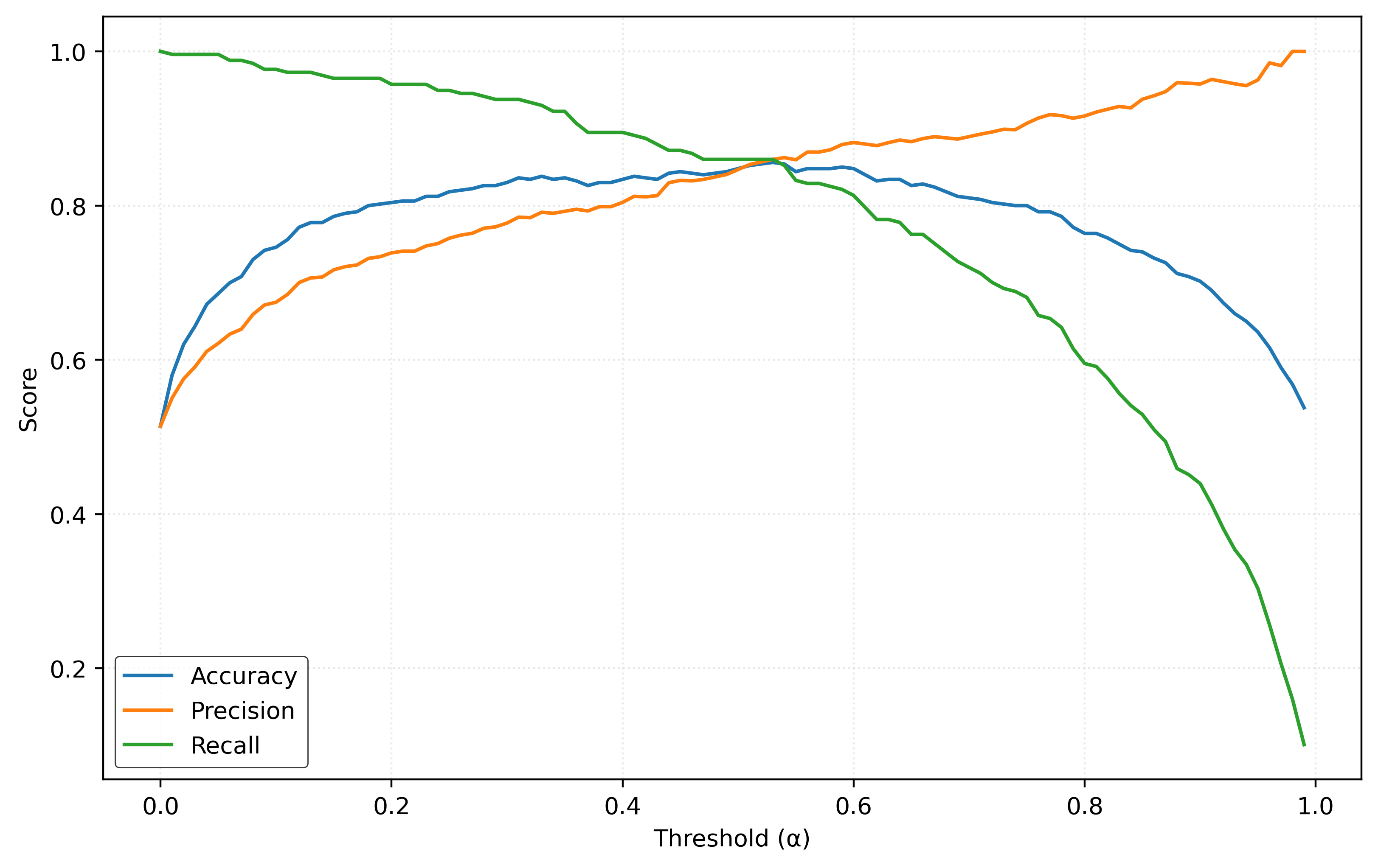 # calculate accuracy, precision, and recall for each threshold