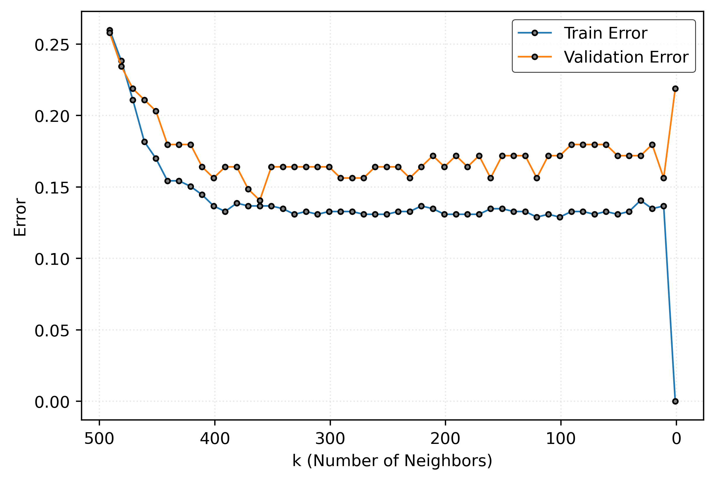 Figure 5 shows how model performance varies with \(k\). At very low \(k\) values, the model performs perfectly on training data but poorly on validation data. At very high \(k\) values, both training and validation performance suffer. The optimal \(k\) balances these extremes.