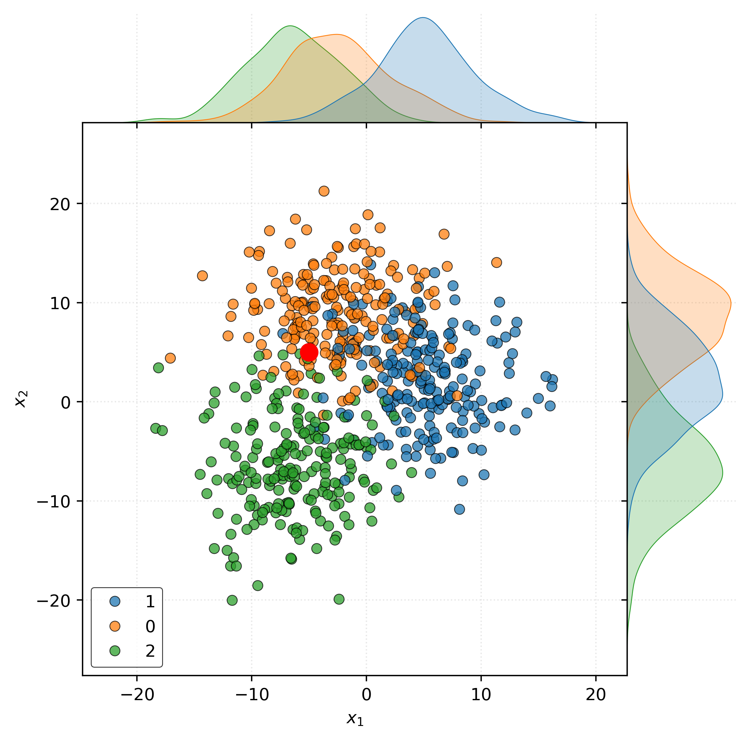 - \(P[Y = 2 \mid \pmb{X} = (-5, 5)] = 0.10\)