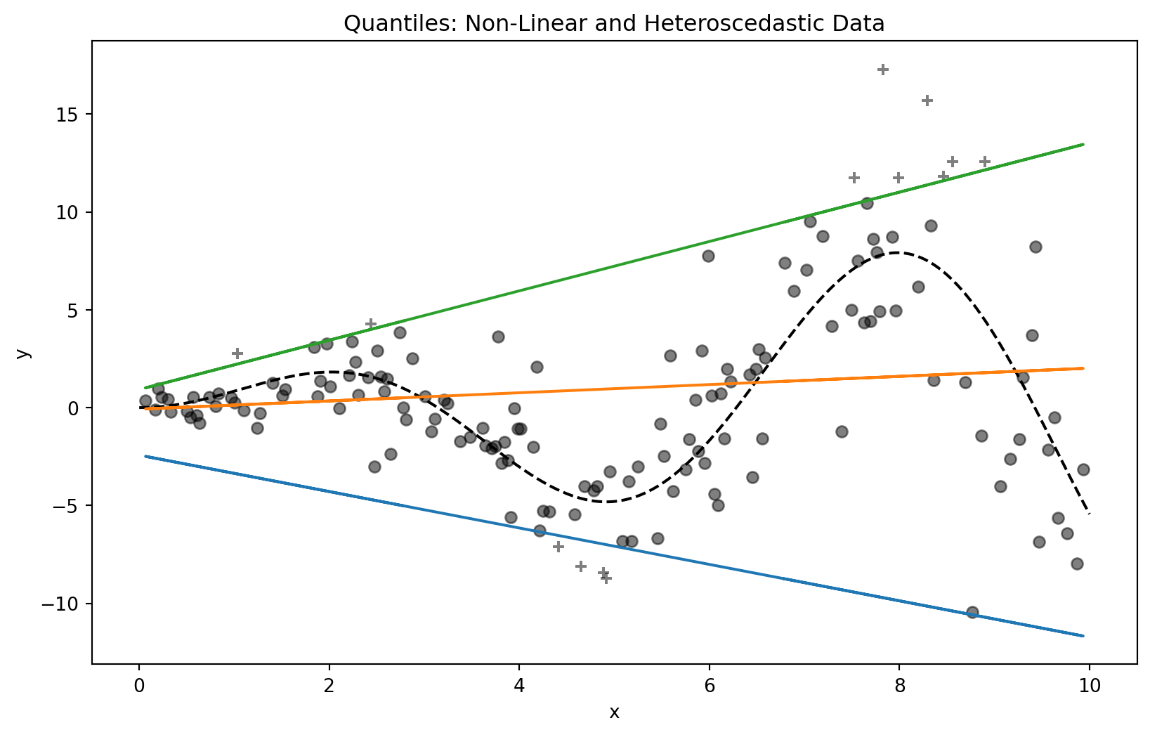 ax.set_title("Quantiles: Non-Linear and Heteroscedastic Data")