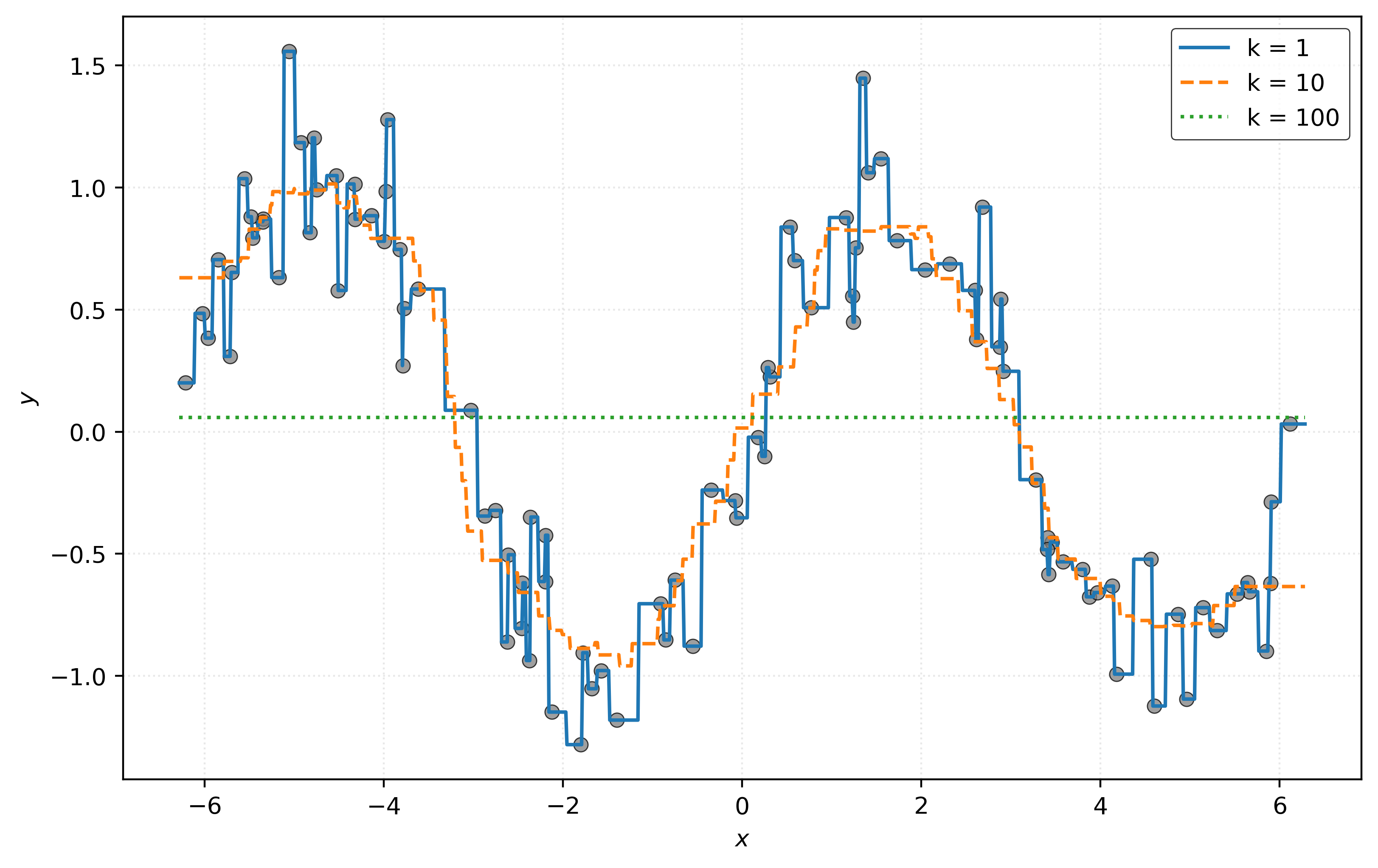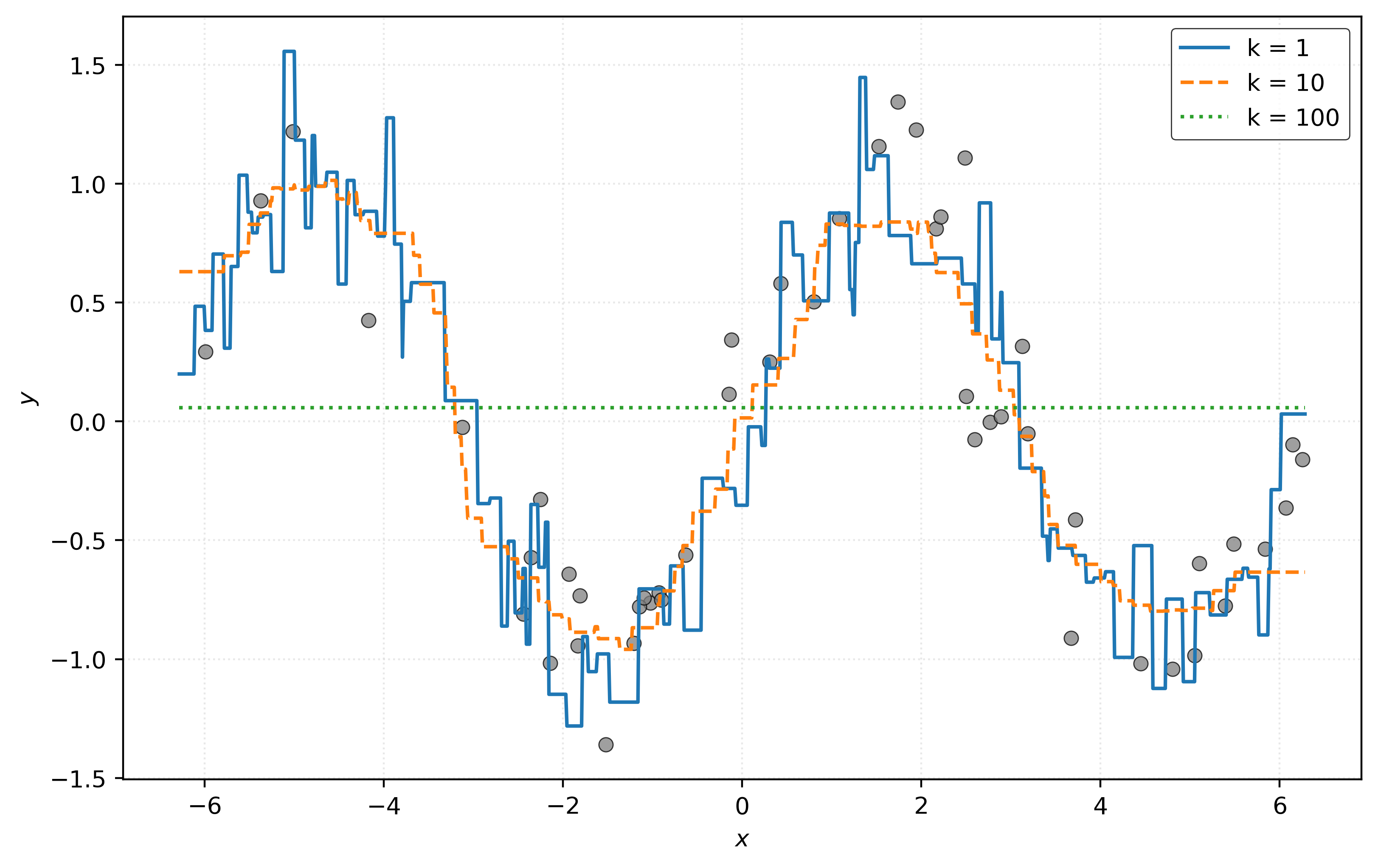 ax.plot(x_plot, knn_010.predict(x_plot), label="k = 100", linestyle="dotted")
