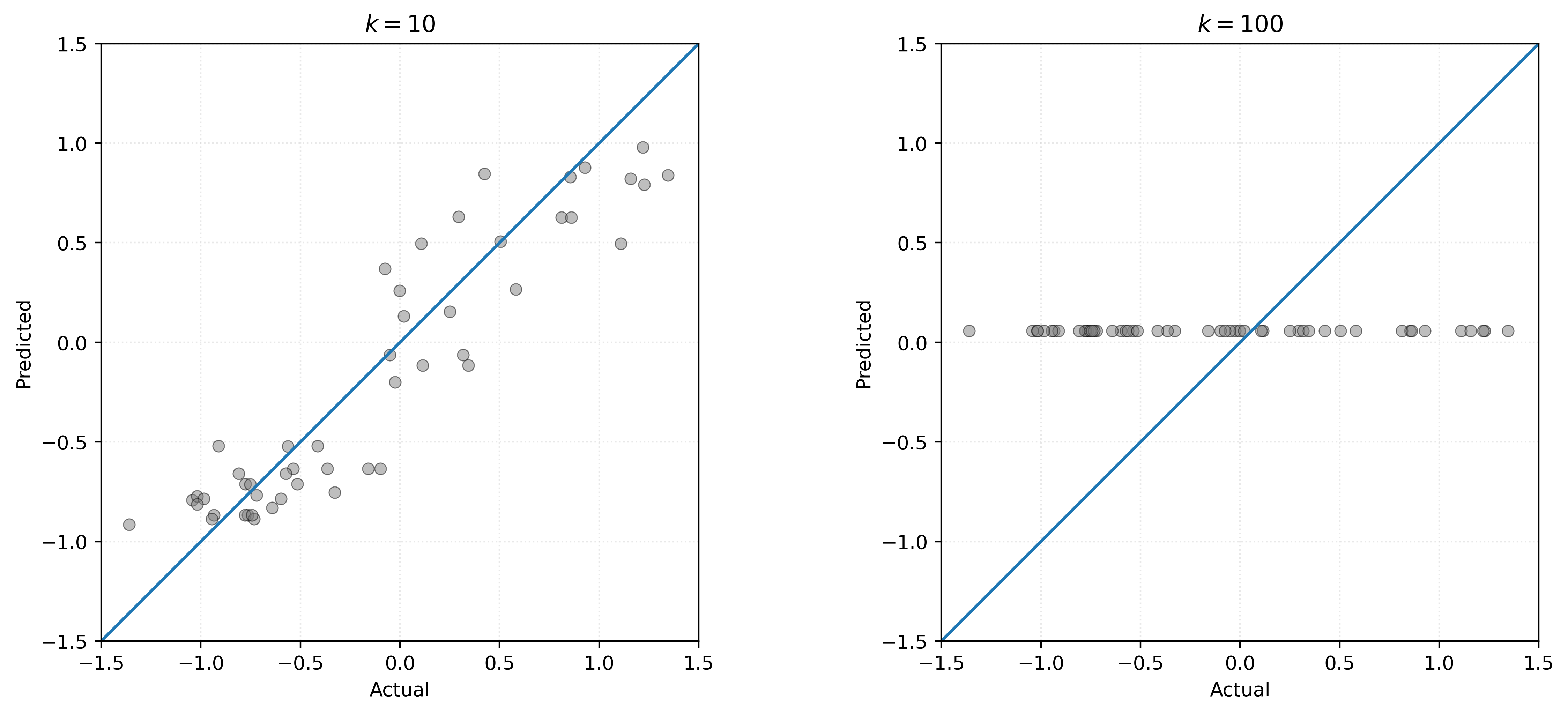 Comparing the two plots in Figure 8, we see that the \(k=10\) model produces predictions that concentrate more tightly around the diagonal line, indicating better performance. For \(k=100\), we have an extreme example of a bad model. It systematically under-predicts large true values, and over-predicts small true values. This is not at all surprising, given that the model only predicts a single value for any possible \(x\) value we use to make a prediction.