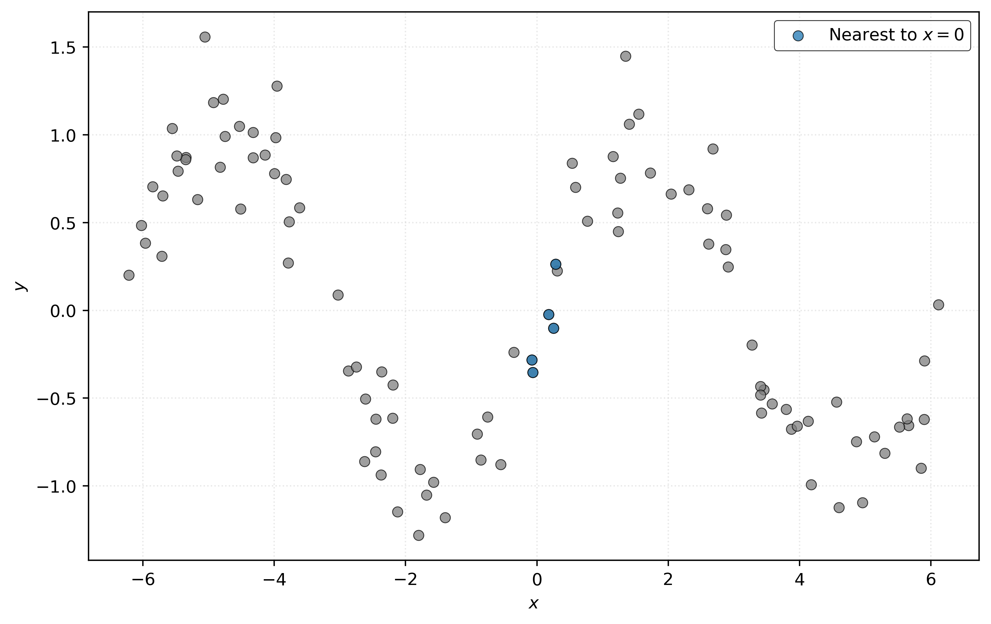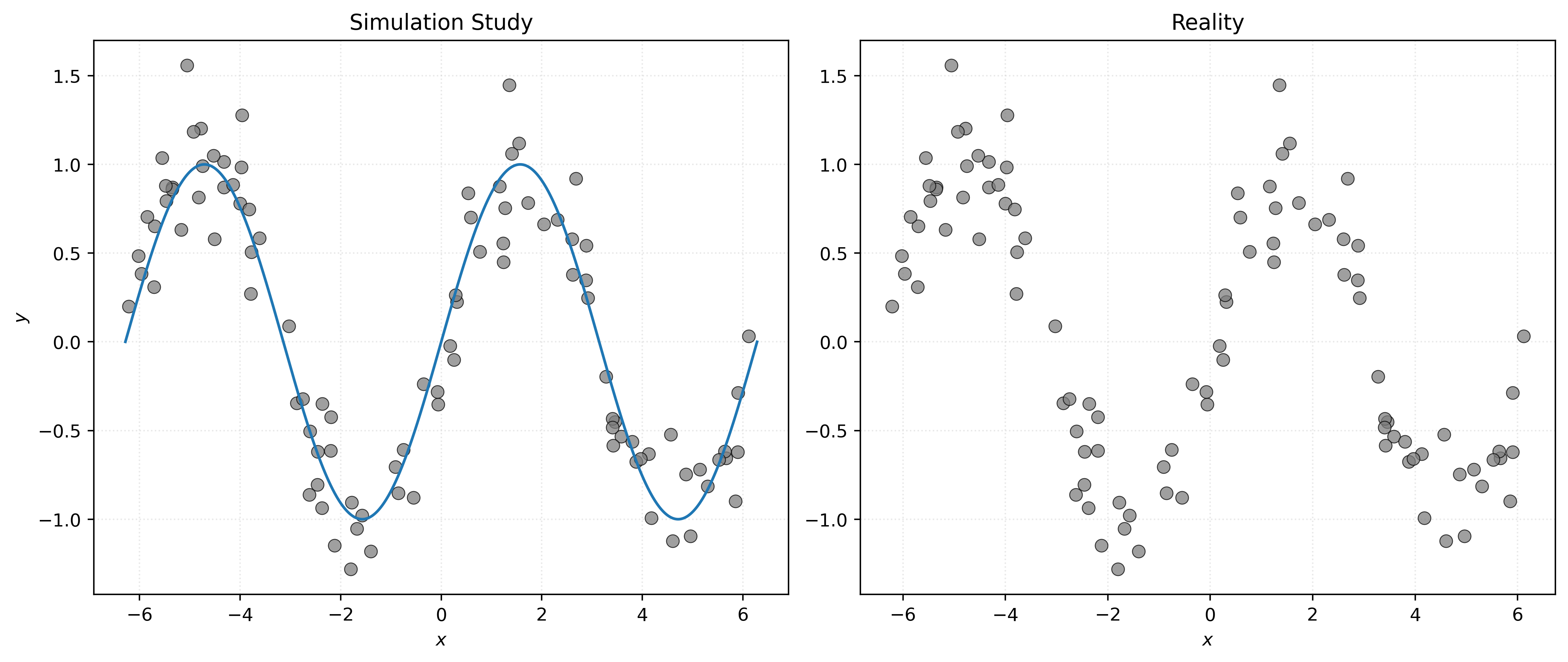 \[ \begin{aligned} X &\sim \text{Uniform}(-2\pi, 2\pi) \\ \epsilon &\sim N(\mu=0, \sigma=0.25) \\ Y &= \sin(X) + \epsilon \end{aligned} \]