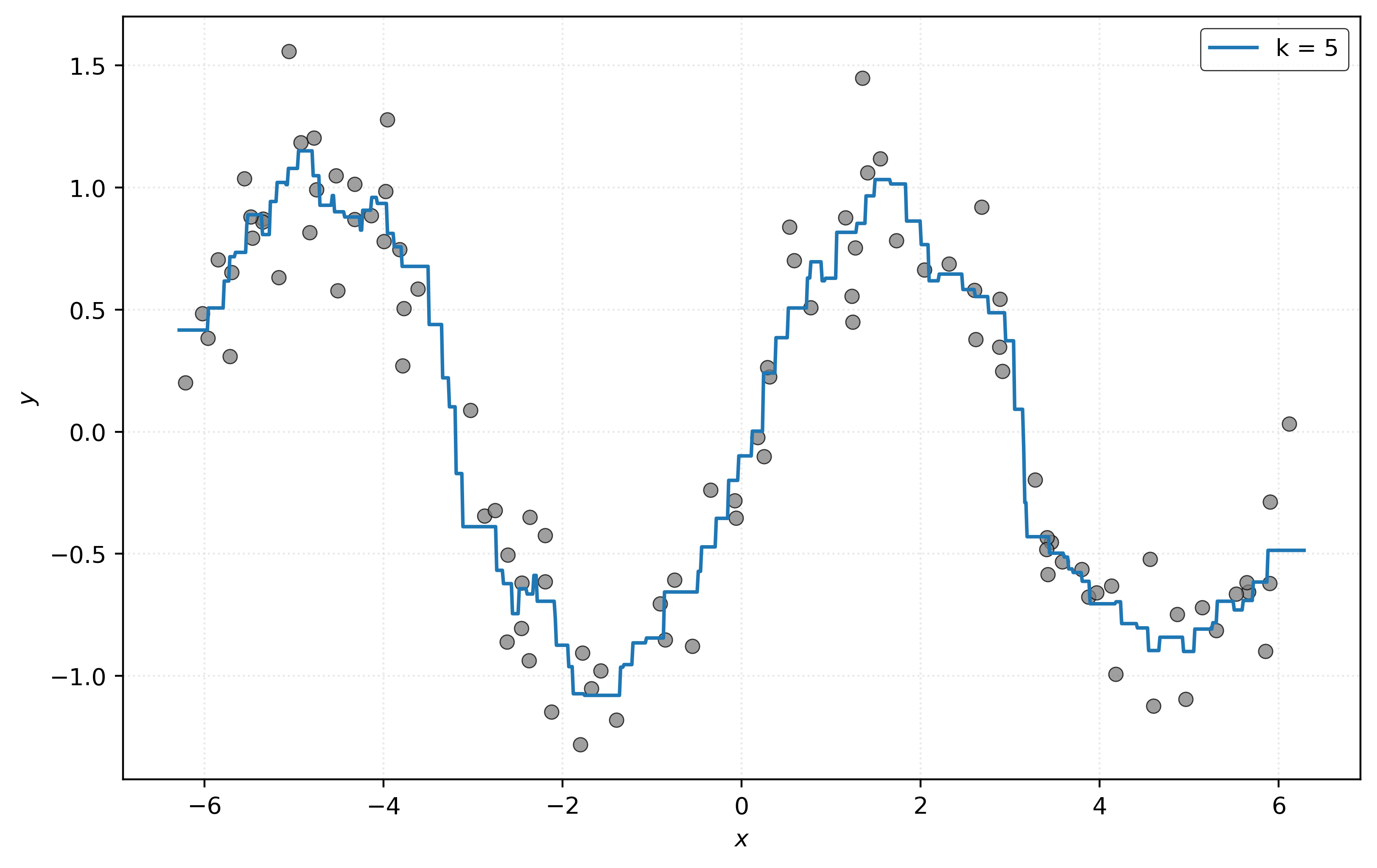 Looking at Figure 5, you probably have a strong preference for the model with \(k = 10\). However, you’re probably cheating a bit. That preference is likely based on knowing the true signal here! The orange dashed curve for \(k = 10\) most closely matches the hidden true signal.