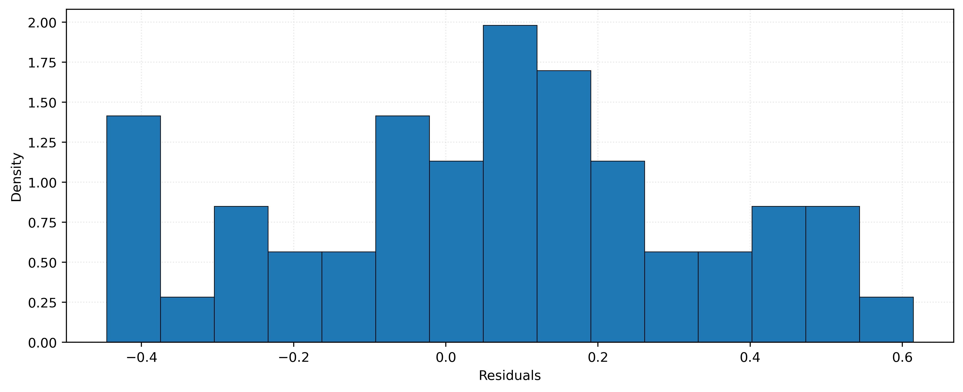 A histogram of residuals helps us understand the distribution of prediction errors. Residuals are the differences between actual and predicted values: \(r_i = y_i - \hat{y}_i\). Ideally, we want residuals to be roughly normally distributed around zero, indicating that our model’s errors are random rather than systematic.