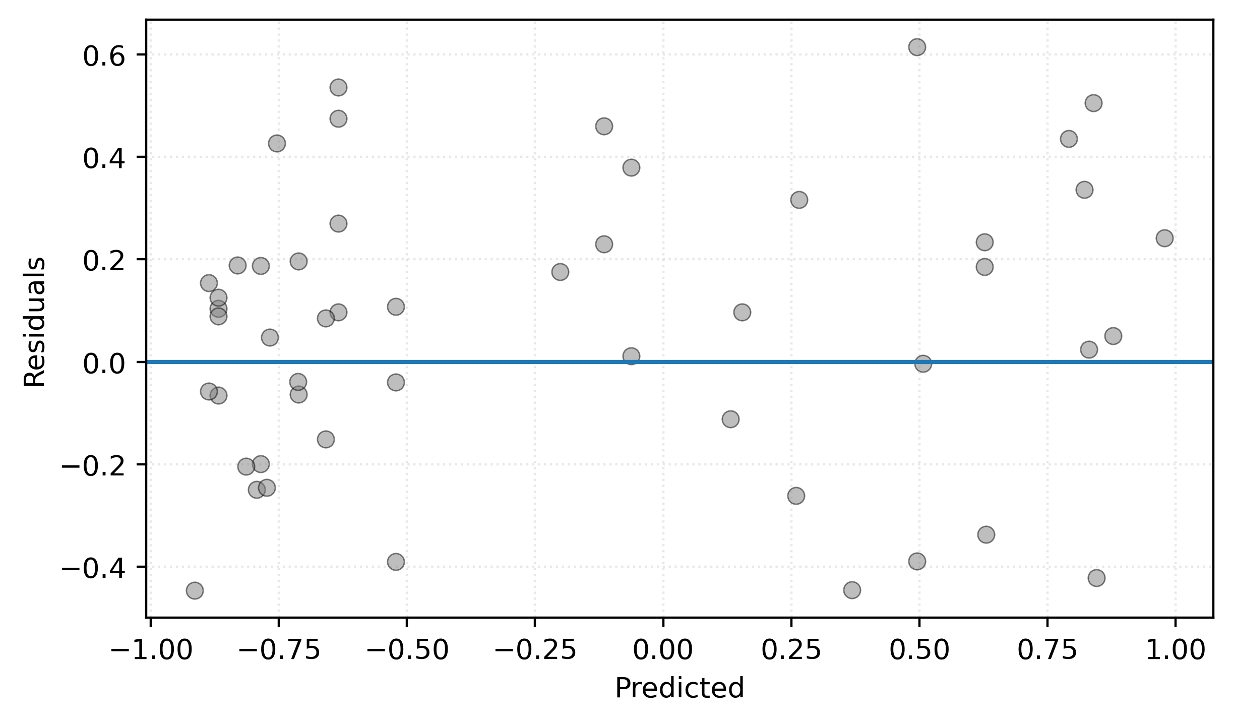 A residuals versus predicted plot helps us identify patterns in model errors. We plot predicted values on the \(x\)-axis and residuals on the \(y\)-axis. While the predicted versus actual plot shows overall model performance, the residuals plot makes it easier to spot systematic patterns in the errors. Ideally, we want to see residuals randomly scattered around zero with no clear patterns. If we observe systematic patterns (such as a curve or increasing spread), it suggests our model may be missing important relationships in the data.