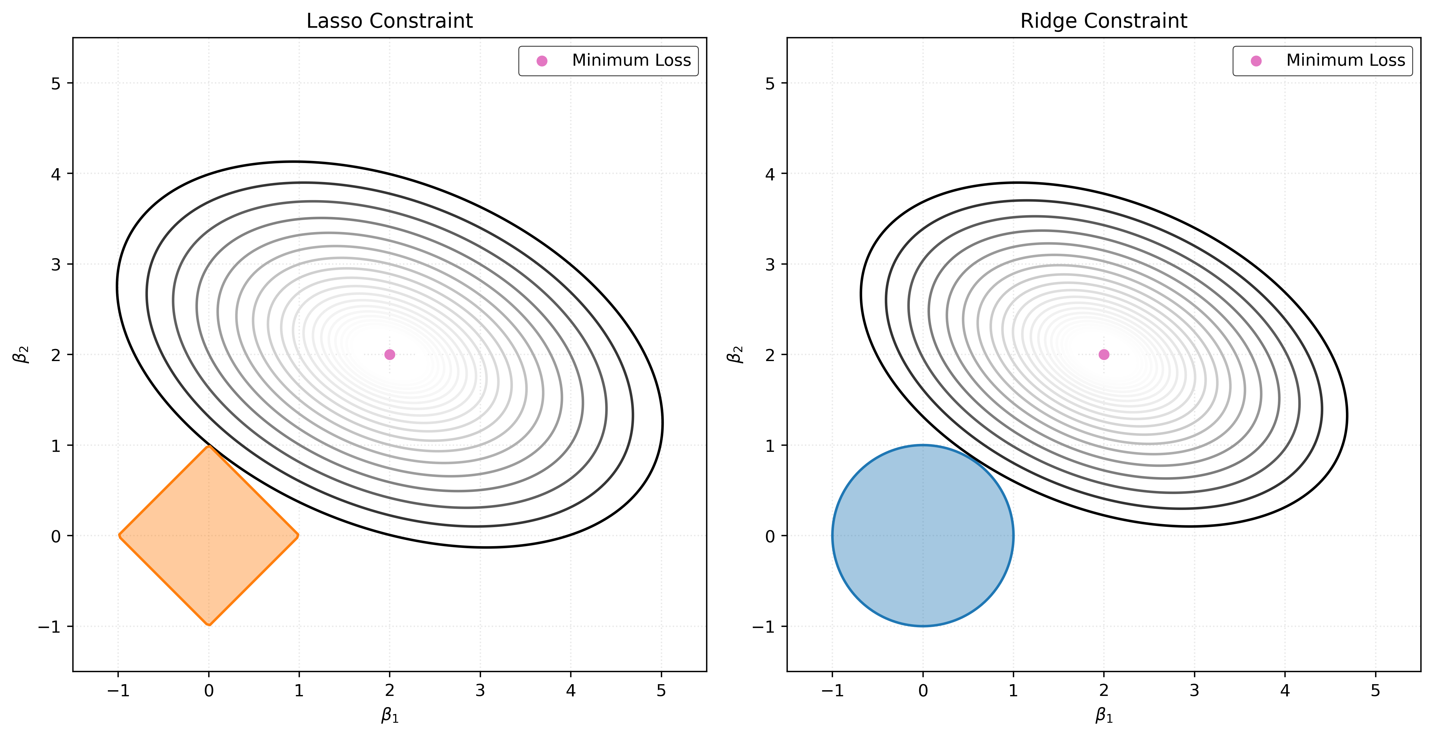 In the visualization above, we are considering a case with two features, and thus two (non-intercept) coefficients, \(\beta_1\) and \(\beta_2\). The contours represent the value of the squared-error loss function, for particular values of \(\beta_1\) and \(\beta_2\). The shaded regions are represent the allowed values of \(\beta_1\) and \(\beta_2\).