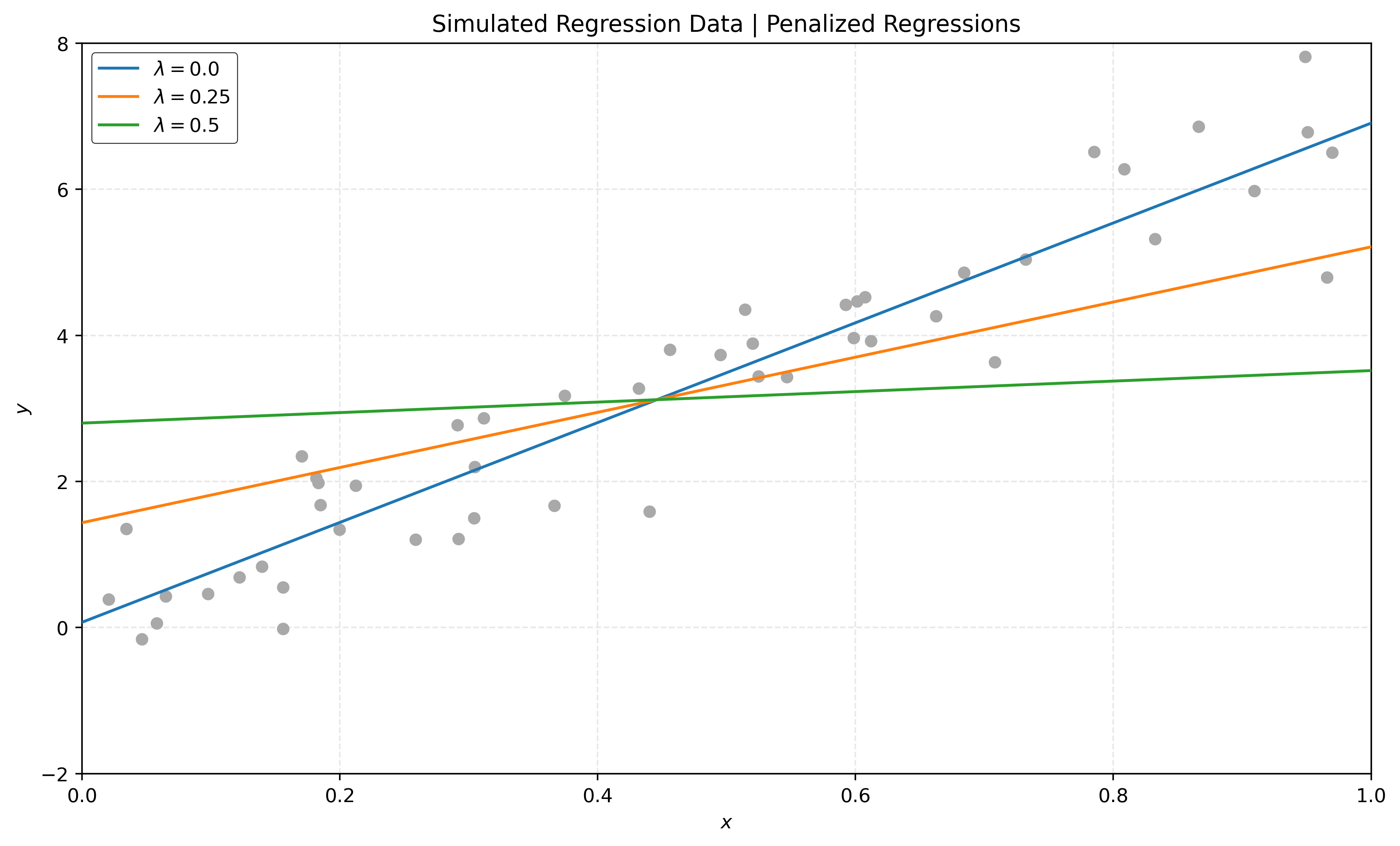 Here, we have fit this modified penalized simple linear regression model to some data, but with three different values of the tuning parameter \(\lambda\).