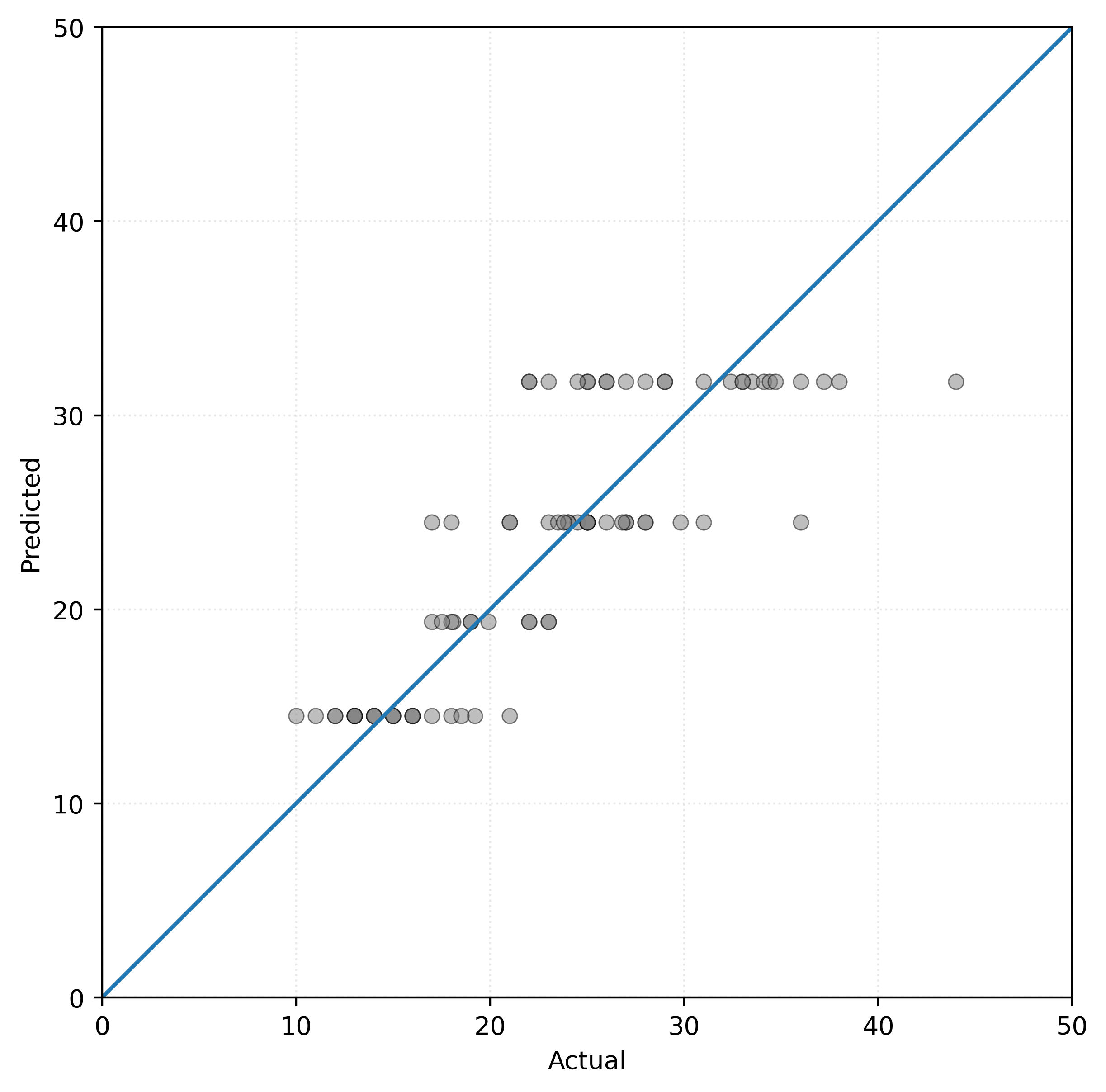 ax.scatter(y_test, tree.predict(X_test), alpha=0.50, c="tab:gray")