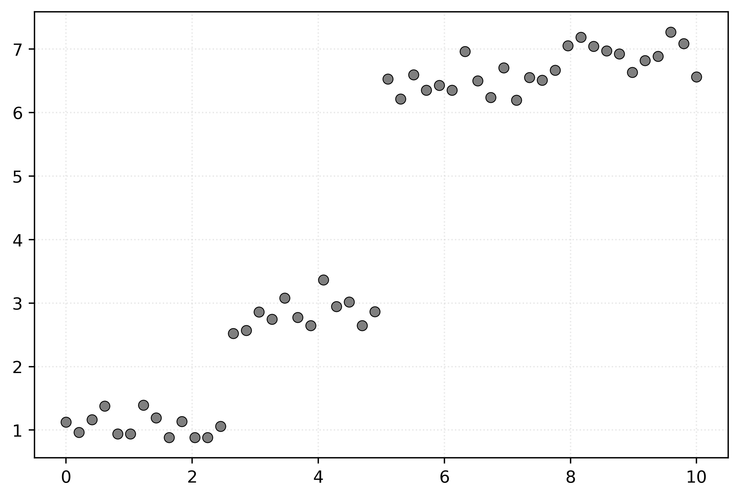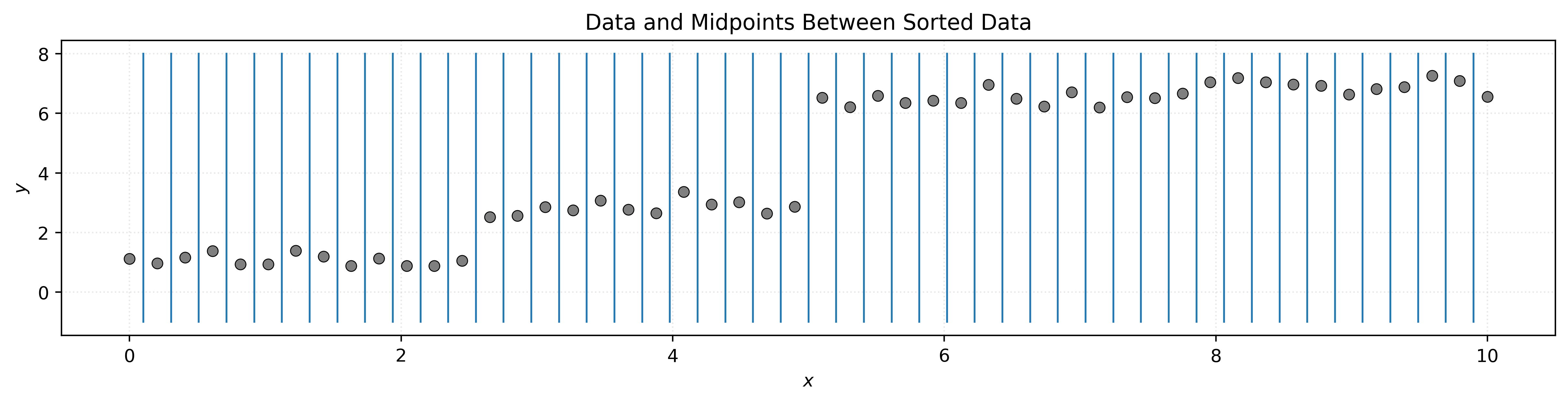 To find the optimal split, we consider all possible features (here just a single feature \(x\)) and all possible cutoff values, then choose the combination that minimizes \(\text{SSE}\).