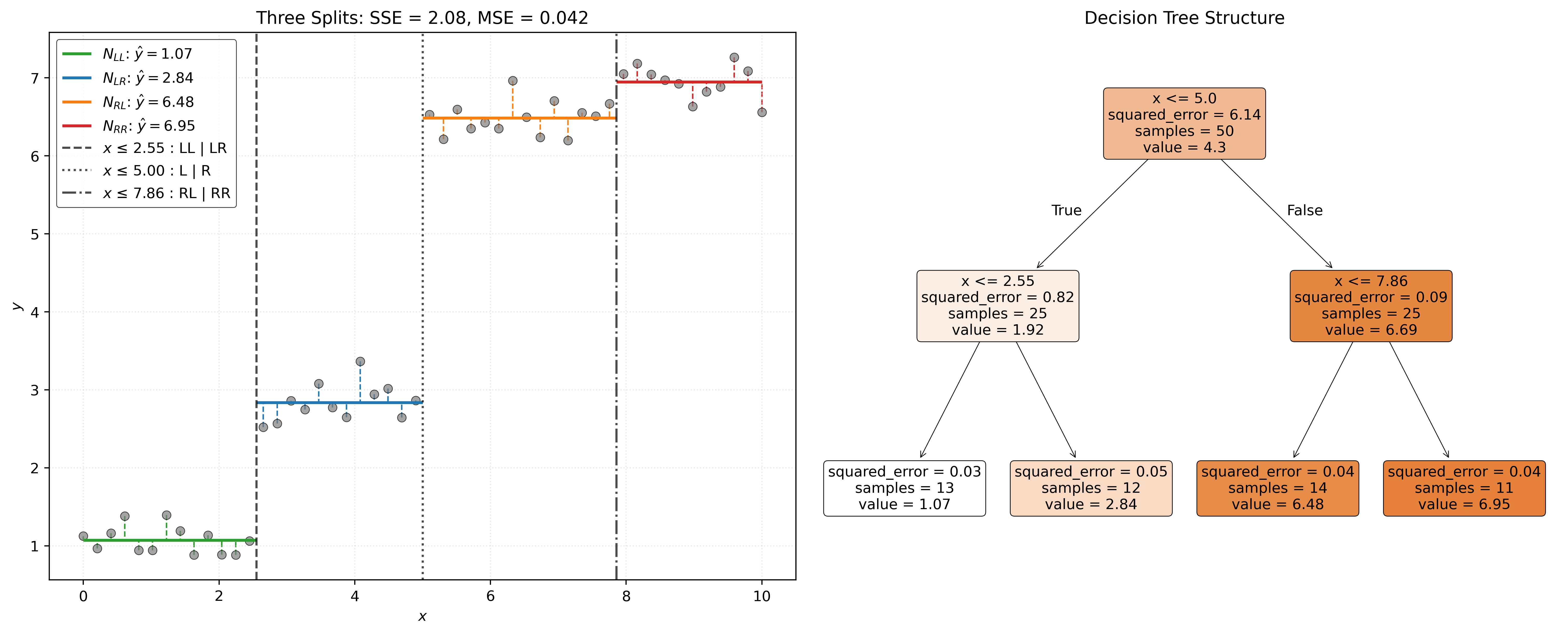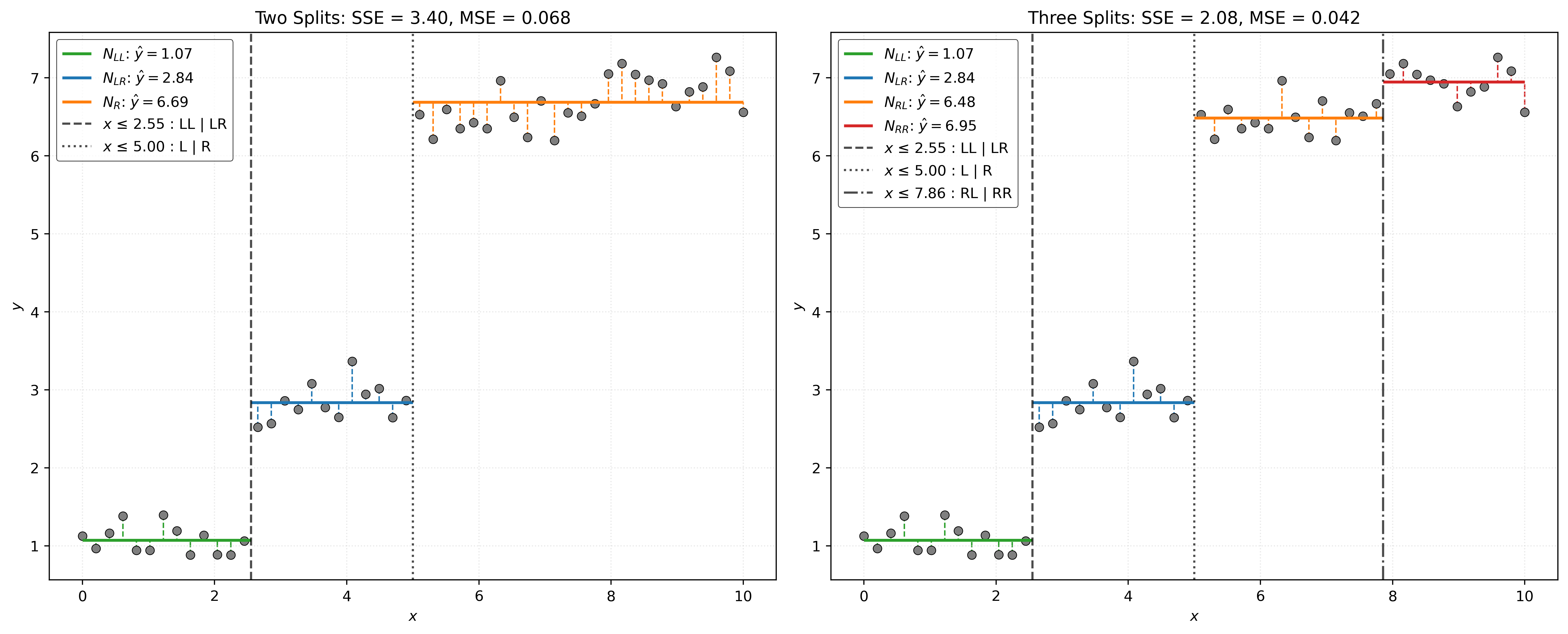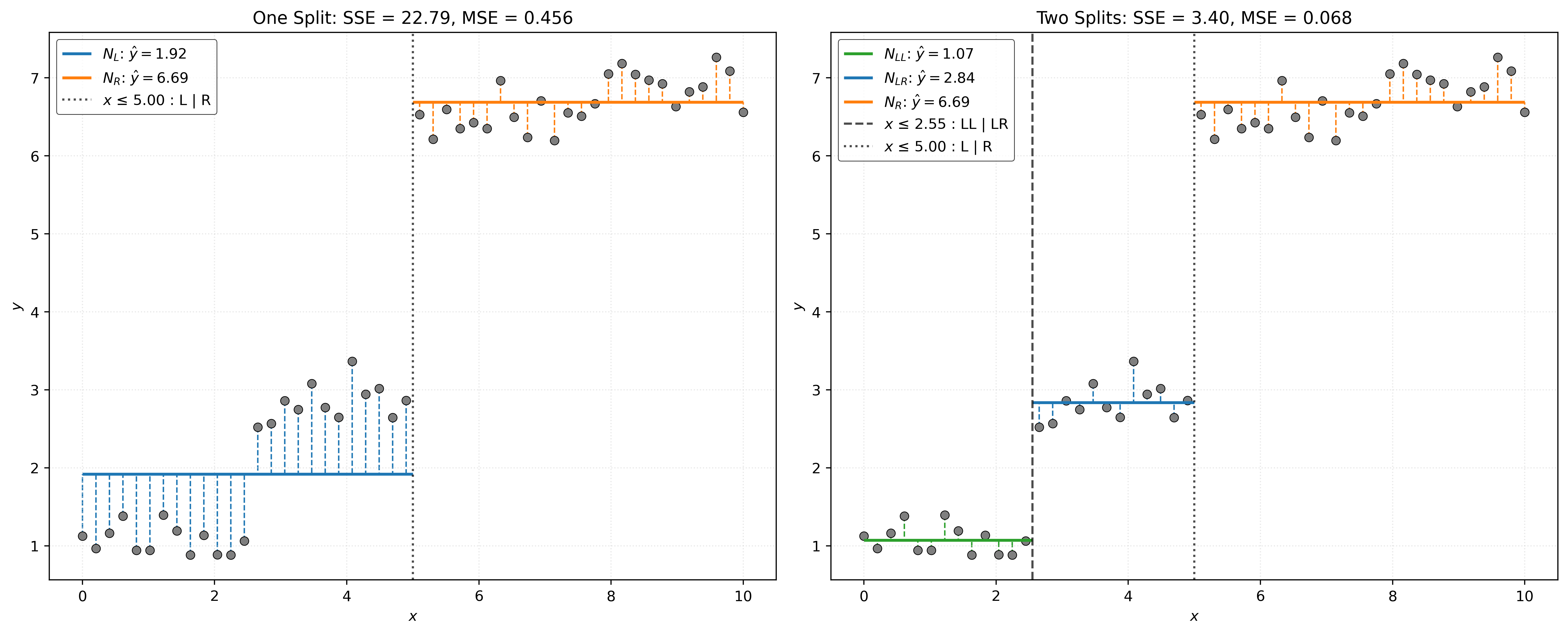 where \(\bar{y}_L\) and \(\bar{y}_R\) are the means of the left and right nodes, respectively. That is, for samples in the left node, \(N_L\), the predicted value \(\hat{y}\) is \(\bar{y}_L\). For samples in the right node, \(N_R\), the predicted value \(\hat{y}\) is \(\bar{y}_R\).